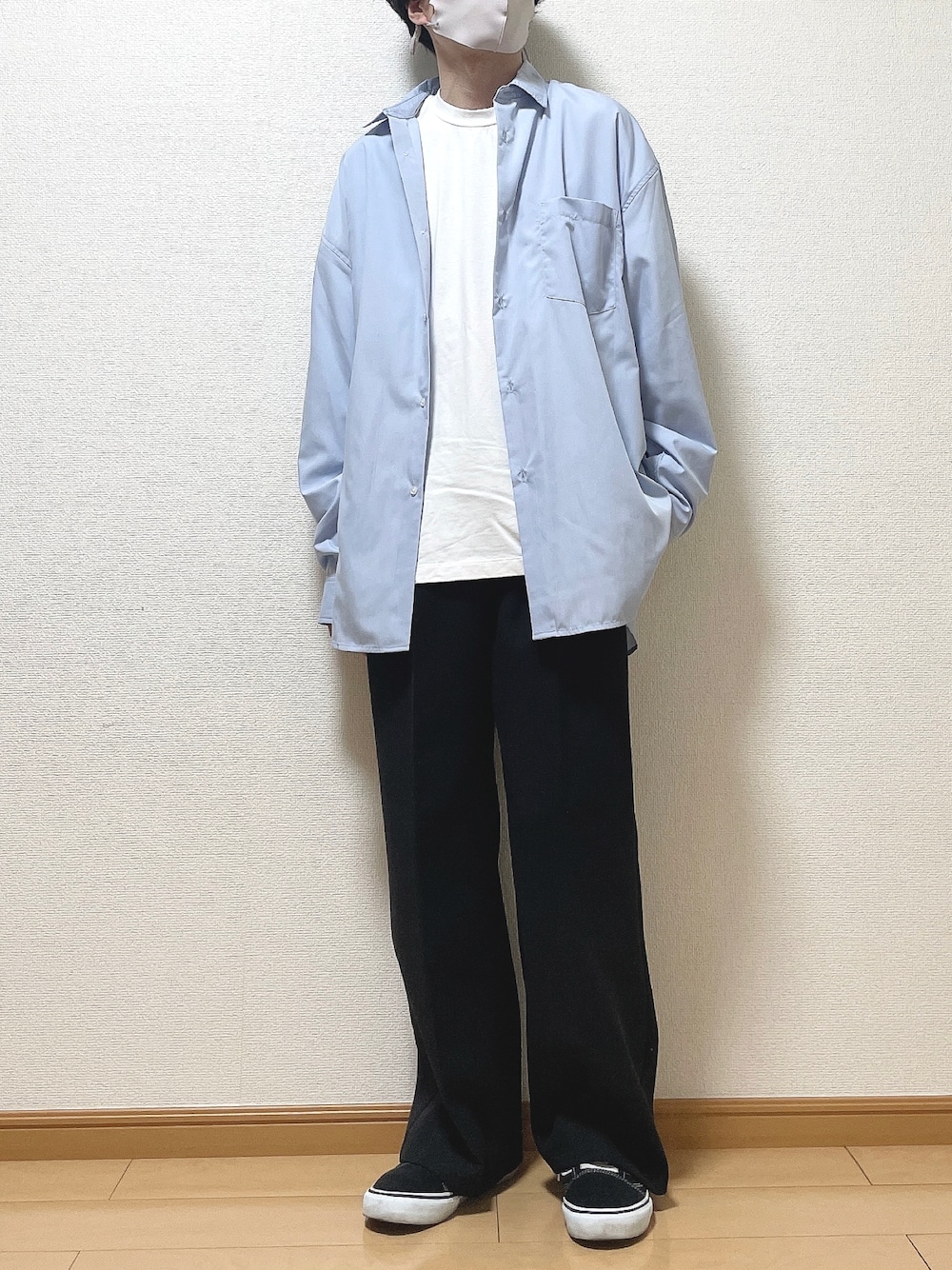おはようございます😊 今回は 【どシンプルコーデ】 モノトーンプラス青シャツでシンプルに! 〈サイズ〉 シャツ L Tシャツ M パンツ M 靴 26