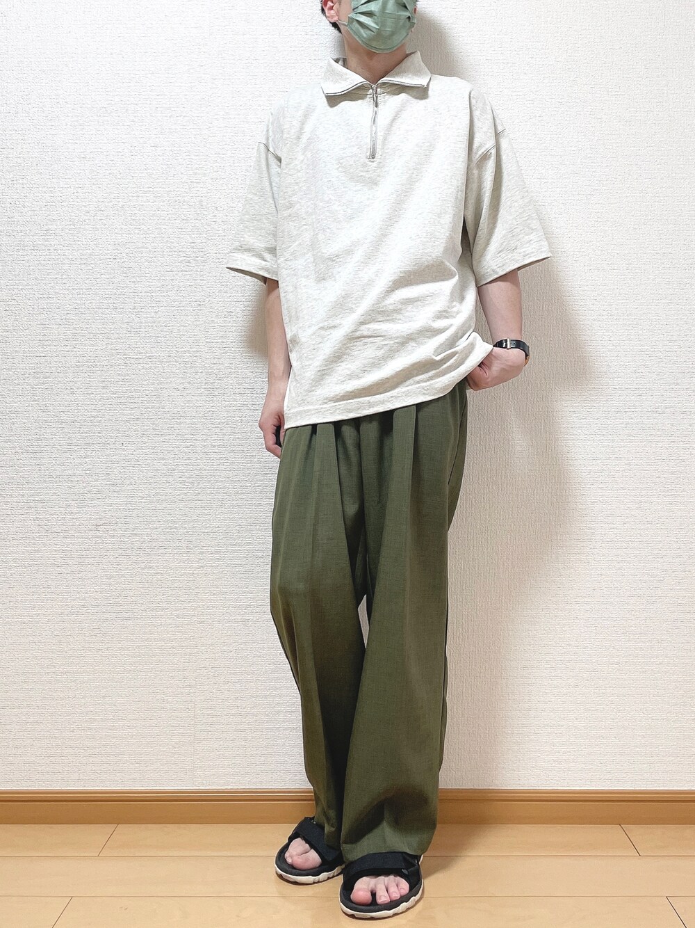 おはようございます〜😊ゆうです! 見て頂きありがとうございます♪ 今回は カーキパンツで大人っぽく ハーフジップで今っぽくコーデしました! 足元は夏っぽくサンダルに👌 【サイズ】 Tシャツ S パンツ M サンダル 26