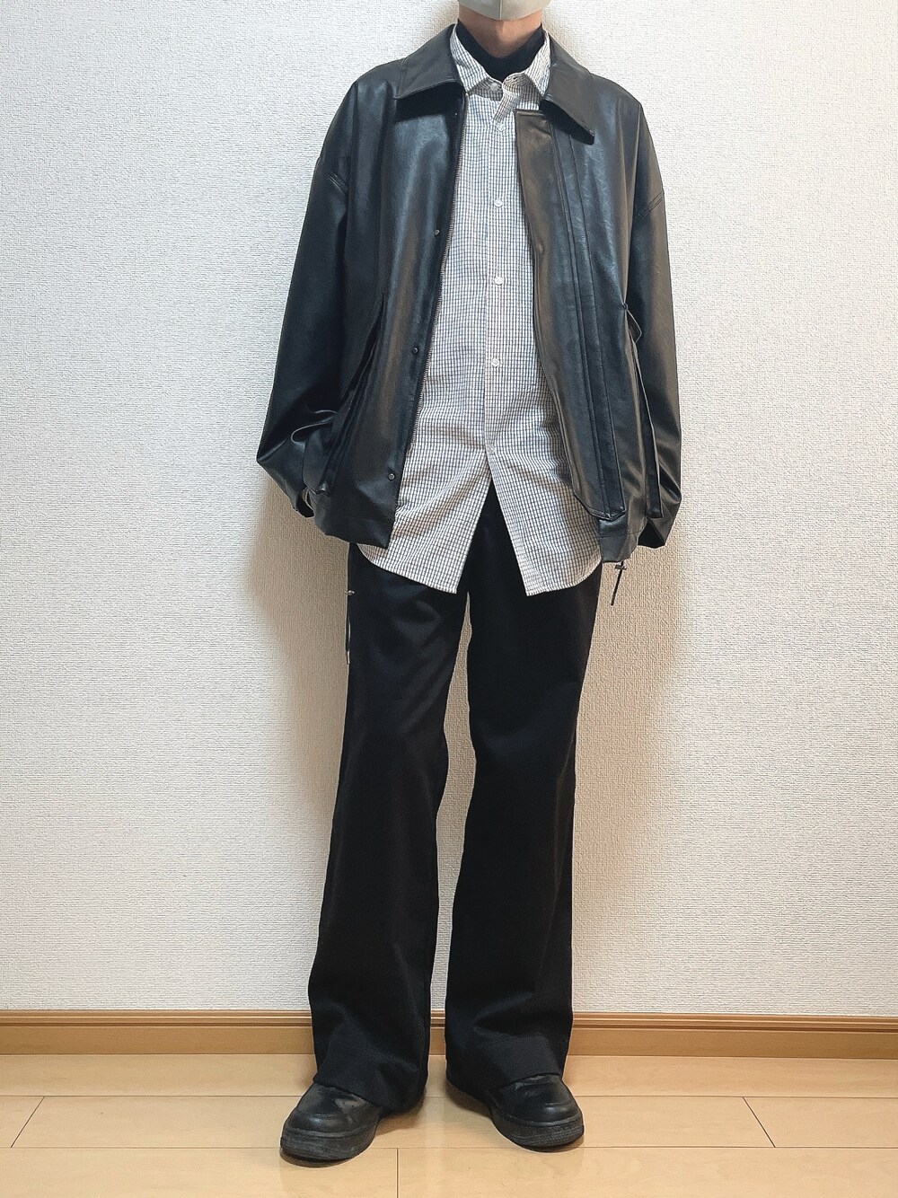 ブラックまとめの中にチェックシャツ👌 インナーにモックネックTでちょっとした差を! 【サイズ】 アウター S シャツ L パンツ XS 靴 26.5