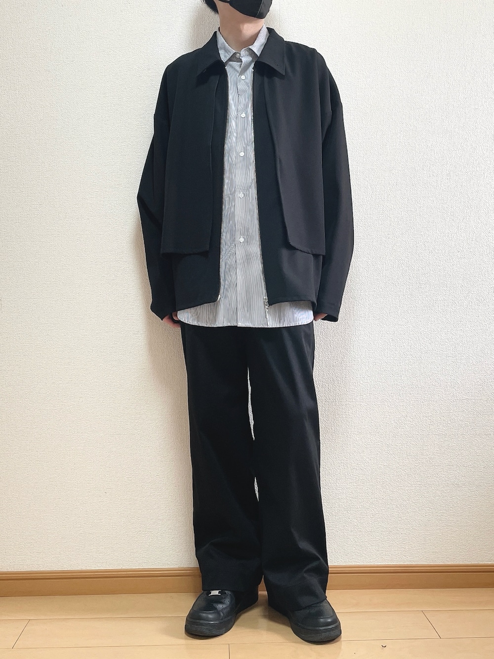 黒ベースでまとめた春コーデ! 春にはストライプシャツ😊 【サイズ】 アウター M シャツ L パンツ XS 靴 26.5