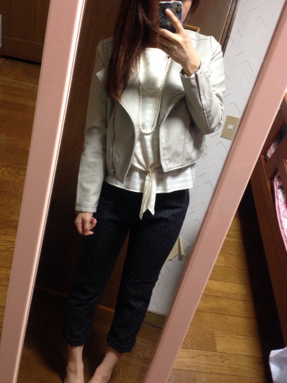 きれいめコーデに明るめカラーのライダースを羽織ってみました パンツの裾はロールアップして足首をすっきりと見せる感じに、、 ライダースは初挑戦で、ハードなものを着るのは不安だったのでグレーにしてみました。 コーデの幅が広がるといいな◎
