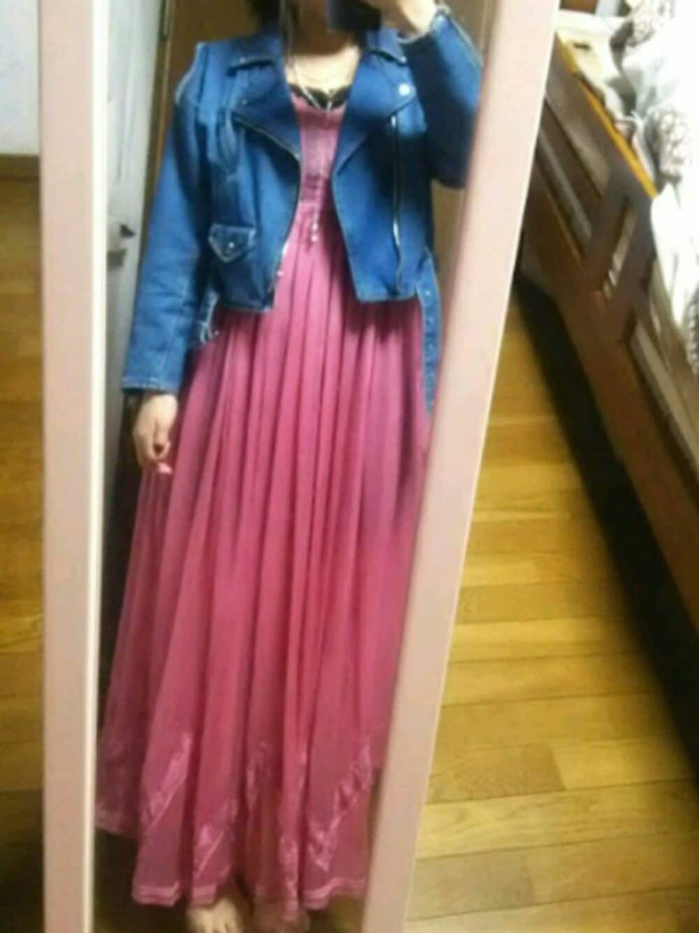 透け感のあるマキシワンピにハードなデニムライダースを合わせて★ 髪は高めでポニーテールにしたい!