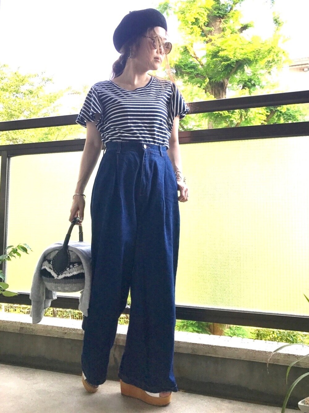 ボーダートップス。 分かりづらいですがこちらフリル袖になっています。去年usedでゲットしたもの。 コンパクトなトップスをハイウエストのボトムスにイン。 これ、何だか落ち着きます。 寝る時にトップスをインしてお腹を冷やさないようにするのと似てるから??