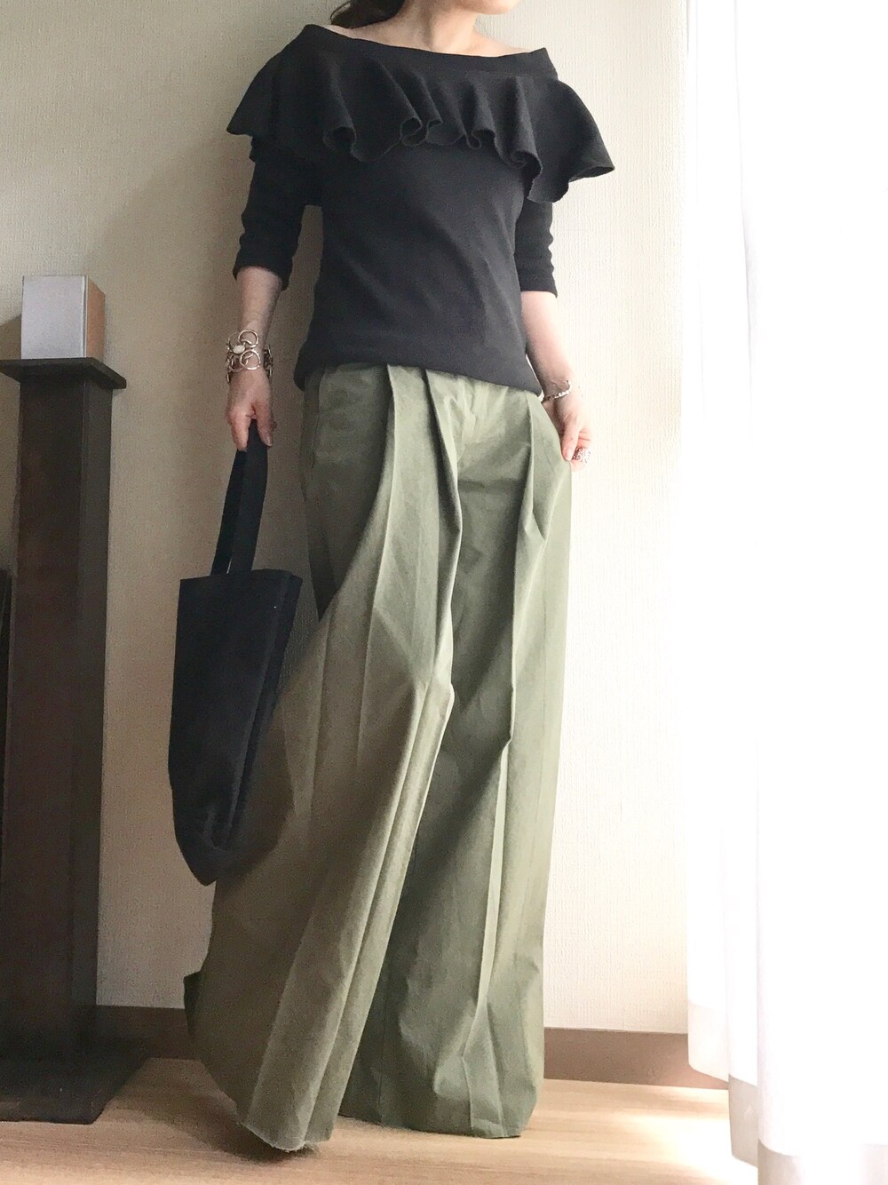 チノパン、可愛すぎる…! カーキのチノを探していてこのこに出会いました! 前にあるプリーツが最強に可愛い♡ 生地は薄めでとても軽いです。 これはデフォルトの長さですがこのあと5センチ丈をカットしました。 まずはテッパンのブラック×カーキで。