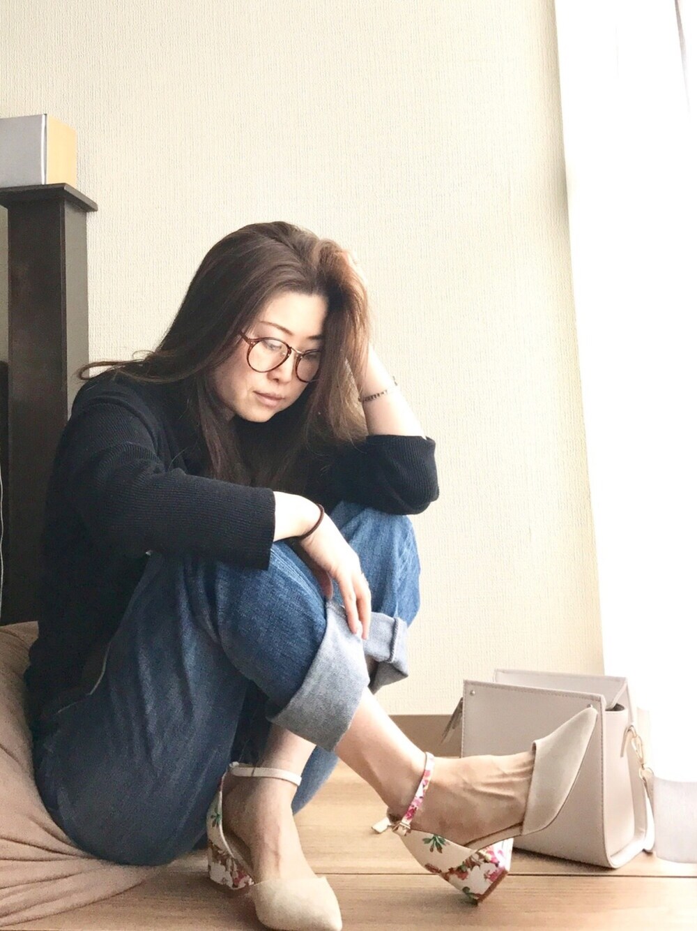 おはようございます♪ 連投続きますがお付き合いいただけたら嬉しいですm(_ _)m 予約していたパンプスが届きました! 踵部分の花柄に一目惚れでした。 最初はデニムに合わせる!と決めていたので予定通りに。 バッグもベージュで合わせた反面トップスは黒で締めてみました。 写っていませんがインナーに襟元がレースになっているタンクトップをチラ見せしています。 撮っていたらコタローがトコトコ来たので一緒にパチリ。 ちっちゃくて黒いので同化していますが小窓に載せました♡