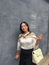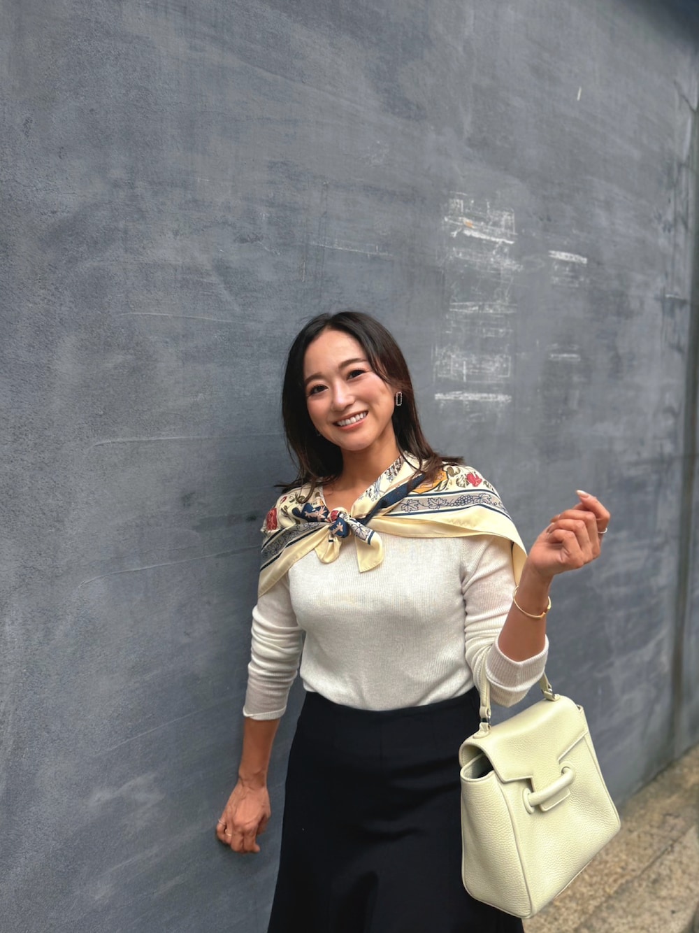 シンプルなトップスに、スカーフをふわっと巻くだけで雰囲気が変わる🕊️ 上品さ+華やかさでお仕事にもお出かけにもぴったりなスタイル✨ バッグは淡いアイボリーで、 全体をやさしいトーンにまとめました🤍