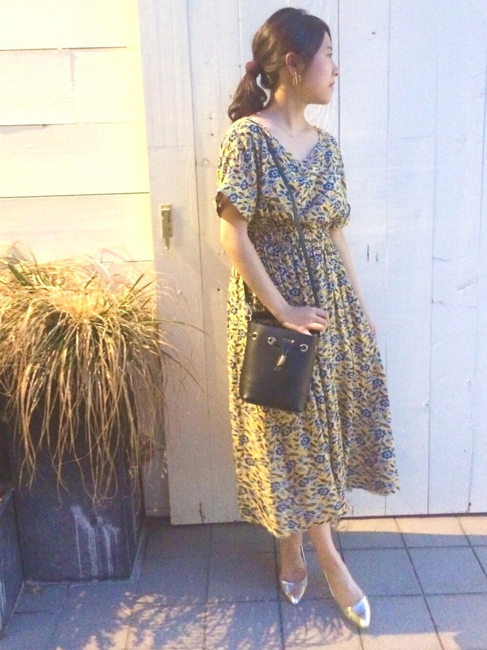niko☺︎のワンピース「裁ち切り花柄ウエストギャザーワンピース」を使ったコーディネート