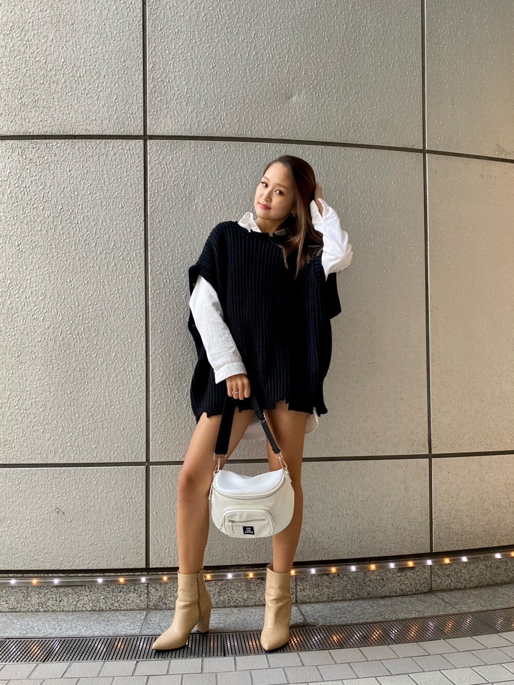 5wayニットの🧶着回し! ベストにしてきてみました! シャツ合わせだとまた違った雰囲気になります🌼 大人っぽくも着れるちゃう万能ニット🧶✨
