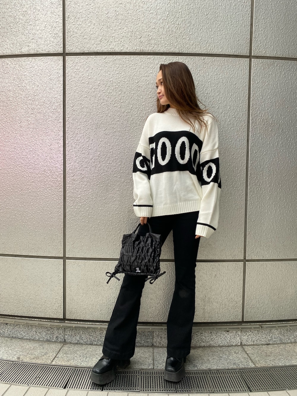 新作のジャガードニット🧶🤍 この大胆なロゴがfigらしいです✌🏽 春先にも着やすいニットはいろんなボトムが合わせやすい✨