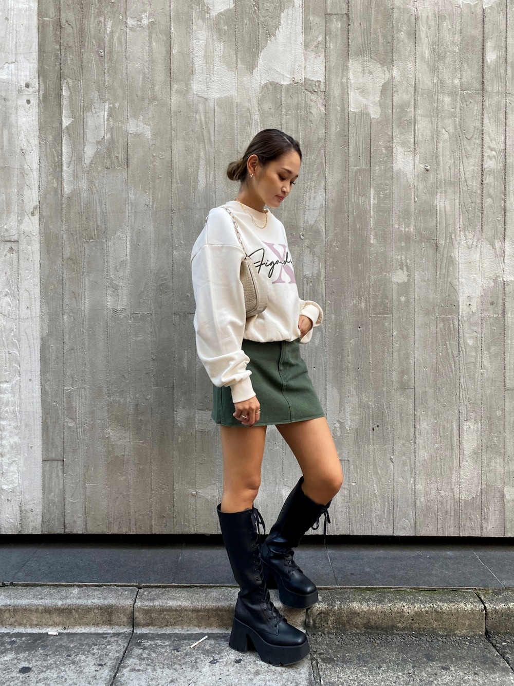 ロゴの刺繍と10周年のプリントが入ったPOはミドル丈なのでミニボトムがとても合わせやすい◎ セットアップで着れるSPもオススメですが刺繍の色と合わせてカーキ色のミニスカ合わせも可愛い🦖 ロングブーツで秋らしく〜🍁