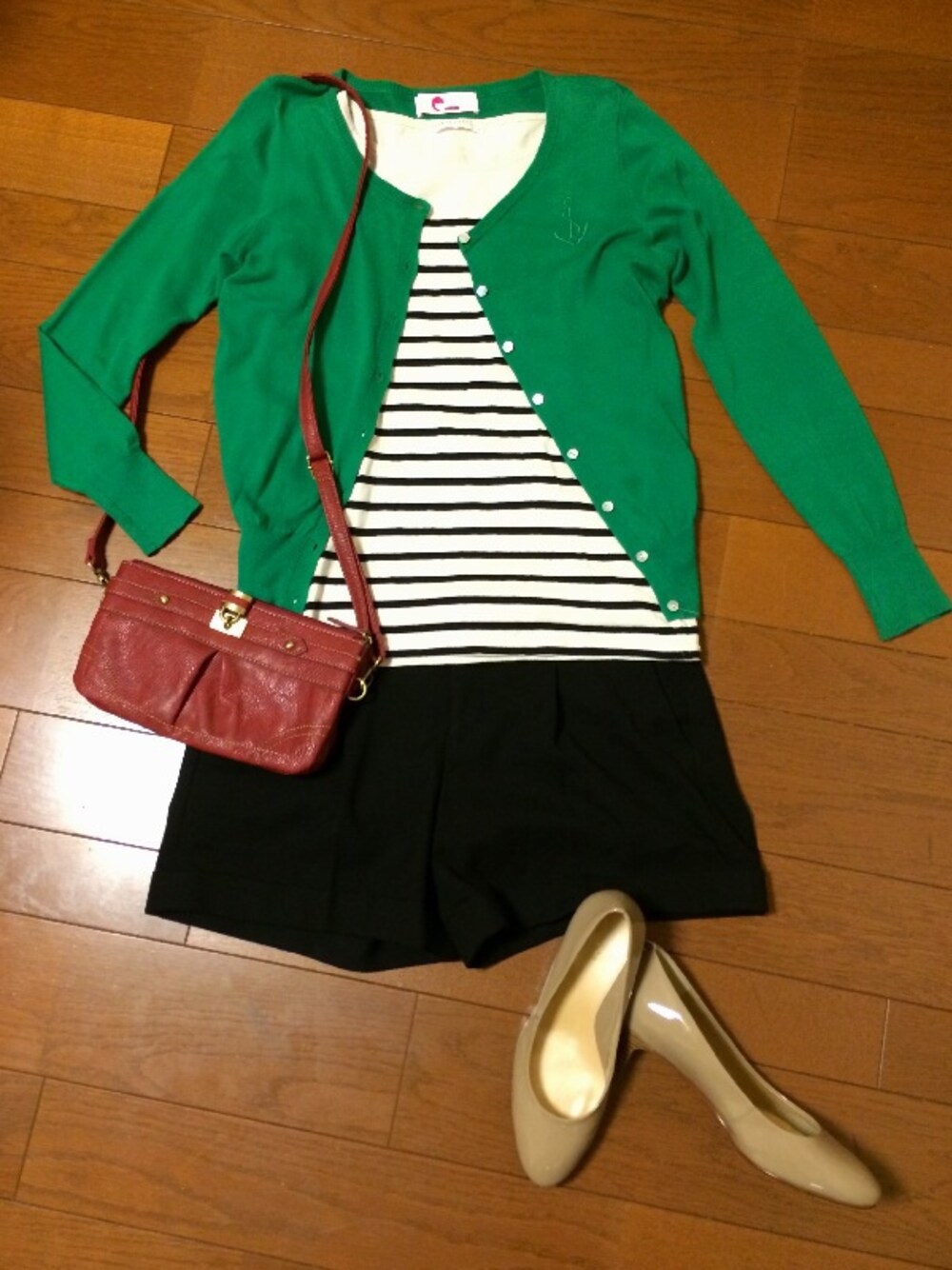 ⚫︎カーディガン:E hyphen world gallery ⚫︎Tシャツ:LOWRYS FARM ⚫︎ショートパンツ:UNIQLO ⚫︎パンプス ⚫︎バッグ 春はグリーンが着たくなります。