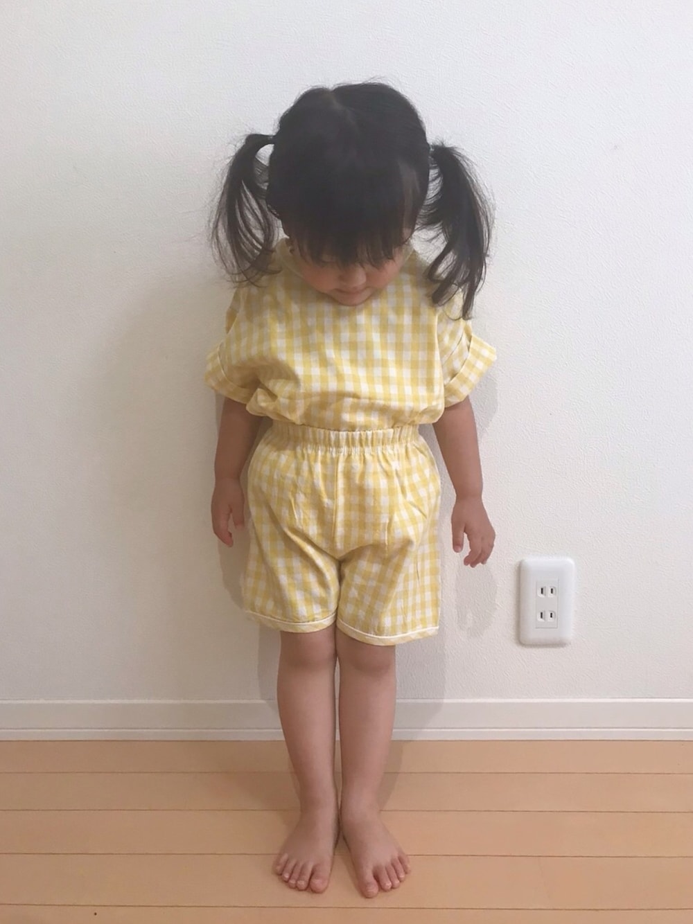 じめじめした日が続いてますね。 チェックのセットアップ くすんだ黄色がかわいいです☺︎ お天気良くなったら 下の子にもお揃いで着せて おでかけしたいな◎ 見ていただき ありがとうございます*