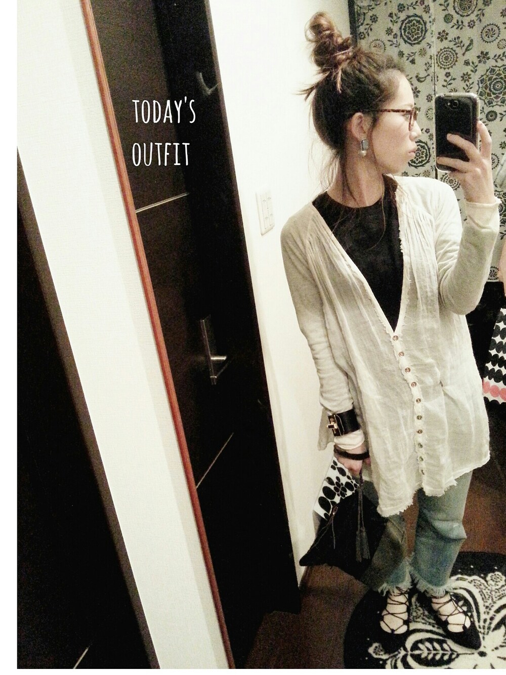 雨だけど☂ 暖かいので、春コーデ🌼🌼🌼 トップスに白フリフリをもってくるだけで、一気に春っぽく✨✨✨