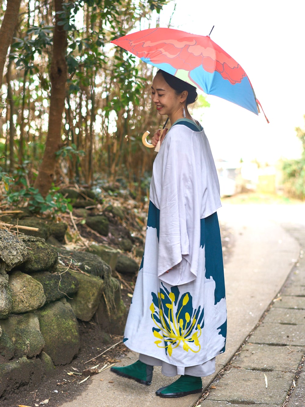 この時期に欠かせない日傘 艶やかに咲き誇る葵の花 大輪の花が目を惹くワンピースは UVカットの羽織付きなので、 紫外線の強い季節のお出かけにぴったりです。