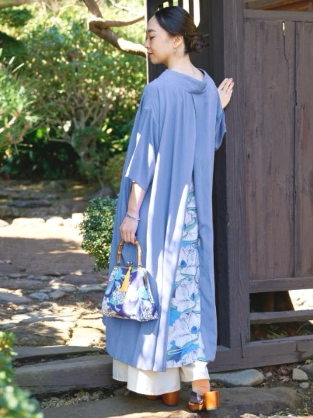 そぞろ歩くと、ちらりと見える夏の色彩。 粋なお洒落を楽しむ八掛。 後ろ姿の美しい花模様が目を惹くワンピース。 正面から見るとシンプルな無地で着回しやすさも◎ モダンな和の装いに。 花模様はモクレン科の泰山木(タイサンボク)
