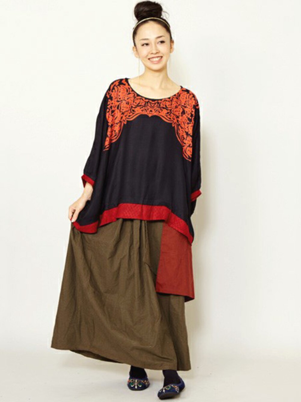 エスニックプリントのドルマンスリーブトップスに シックなカラーの変形スカートをコーディネートしてみました♪ 秋冬コーデにおすすめのボヘミアンスタイルです☆★