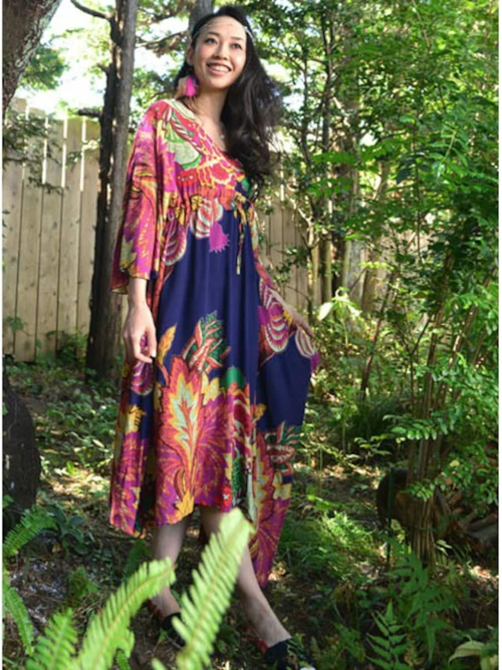 ボヘミアン&ヒッピースタイルに+.**…━☆★ トレンドの南国風テキスタイルを 独特なエスニックカラーでデザインしたワンピース。 日本古来の着物からインスピレーションを得てデザインしました♪