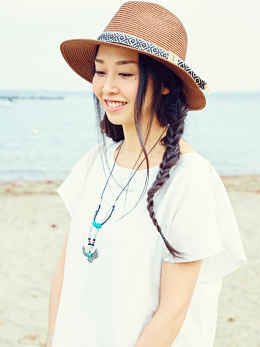 メンズライクなイーグルのネックレスを 白ワンピに合わせてみました♪ ターコイズカラーで夏に着けたくなるデザインです★