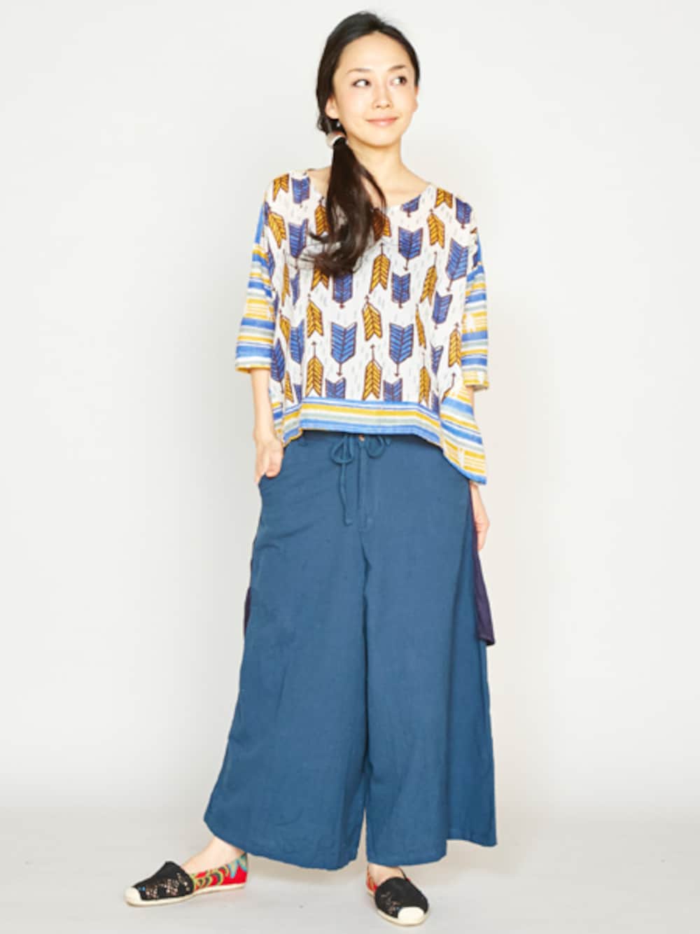 【ただいま大好評開催中!】 チャイハネ★サマーセールのアイテムを使ったコーディネート★ 人気のアロー(矢)モチーフをひとつひとつハンドメイド・木版プリントで表現したインド綿のショートトップス&サローン付きのワイドパンツを組み合わせました★ サローンは首の後ろで結んでホルターネックにするとジレ風サロペットにもなっちゃいます◎ その日の気分でいろいろコーディネートできて楽しいアイテムですよ♪♪