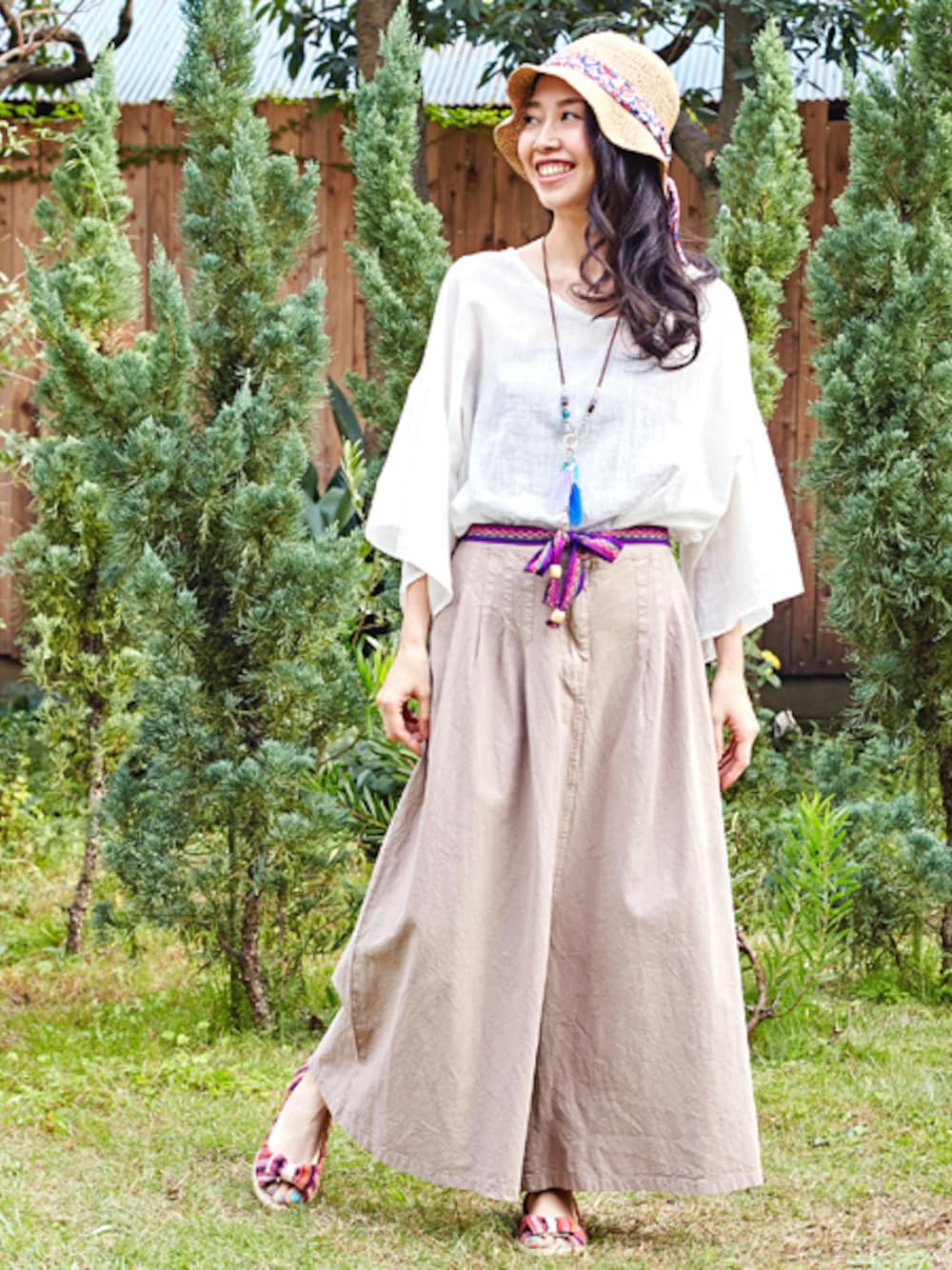 ボリュームたっぷりのスリーブトップスに ワイドパンツを合わせた春コーデ★* ウエストのリボンとカラフルなシューズでアクセント♪ エスニックテイストだけど、カジュアルに◎