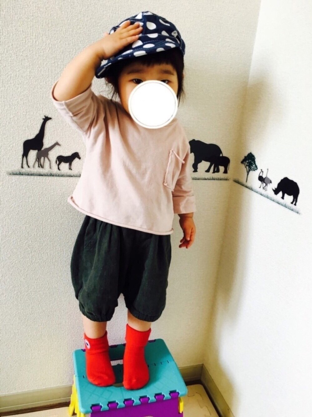 出産祝いで頂いた帽子。 やっとかぶれるようになったね~。 韓国服のシンプルさとゆる〜い感じが好き♡ コンバースの靴下はしまむら~📛