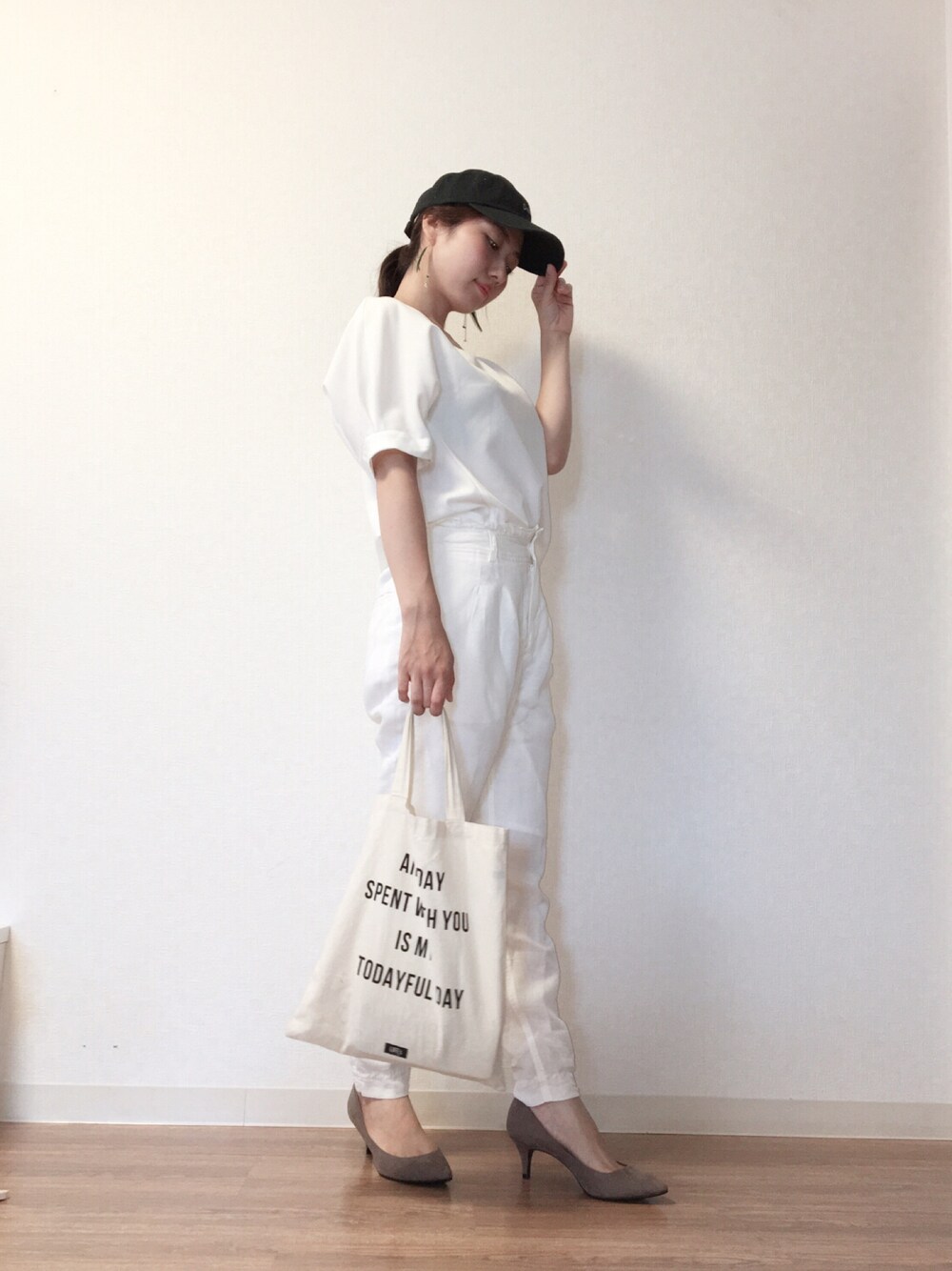 ホワイトコーデにキャップとトートバッグでカジュアルにしました😊💕スニーカーか迷いましたがパンプスで女性らしさを忘れずに😍 毎日暑いですが頑張りましょう😊🎵