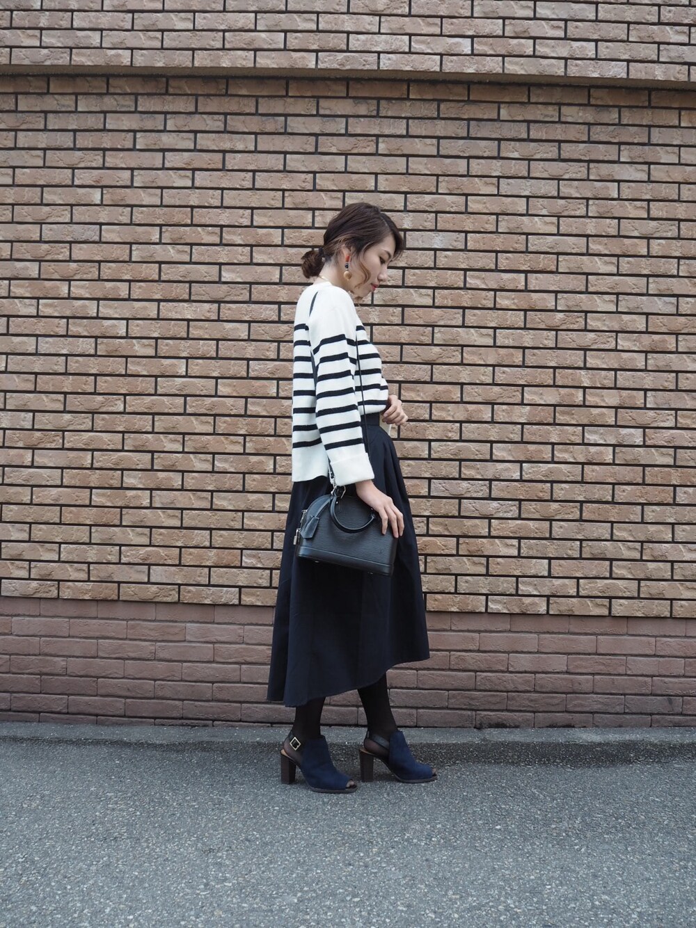 本日のコーデ♡♡ シンプルにボーダーのtopsにネイビーのフレアスカートを履きました♡ このGUのフレアスカート前から後ろにかけて長くなっておりボリュームもあって凄く可愛いくて普段あまりスカート履かない私ですが これはかなりお気に入りです(ृ ु ´͈ ᵕ `͈ )ु