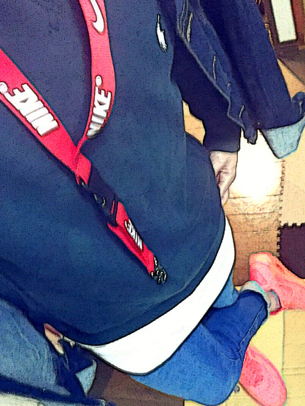 ラルフローレンのスウェットに丈長Tシャツを重ね着し、物足りなかったのでヌーディのデニムジャケットを重ね着しました😎 靴はNikeのAIR MAX 90 ultra brのクリムゾンレッドです!ランヤードは靴の色に合わせました😋