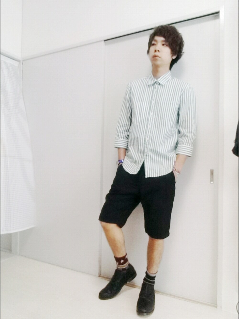 明日は健康診断で早起きなので、明日のコーデを今のうちに(。-∀-) 血取られるのにがくぶるしてます((((;゚Д゚)))) ストライプシャツはグリーンのラインでとっても爽やか♪ シンプルすぎておもしろみがないので靴下で遊んでみる\(^o^)/