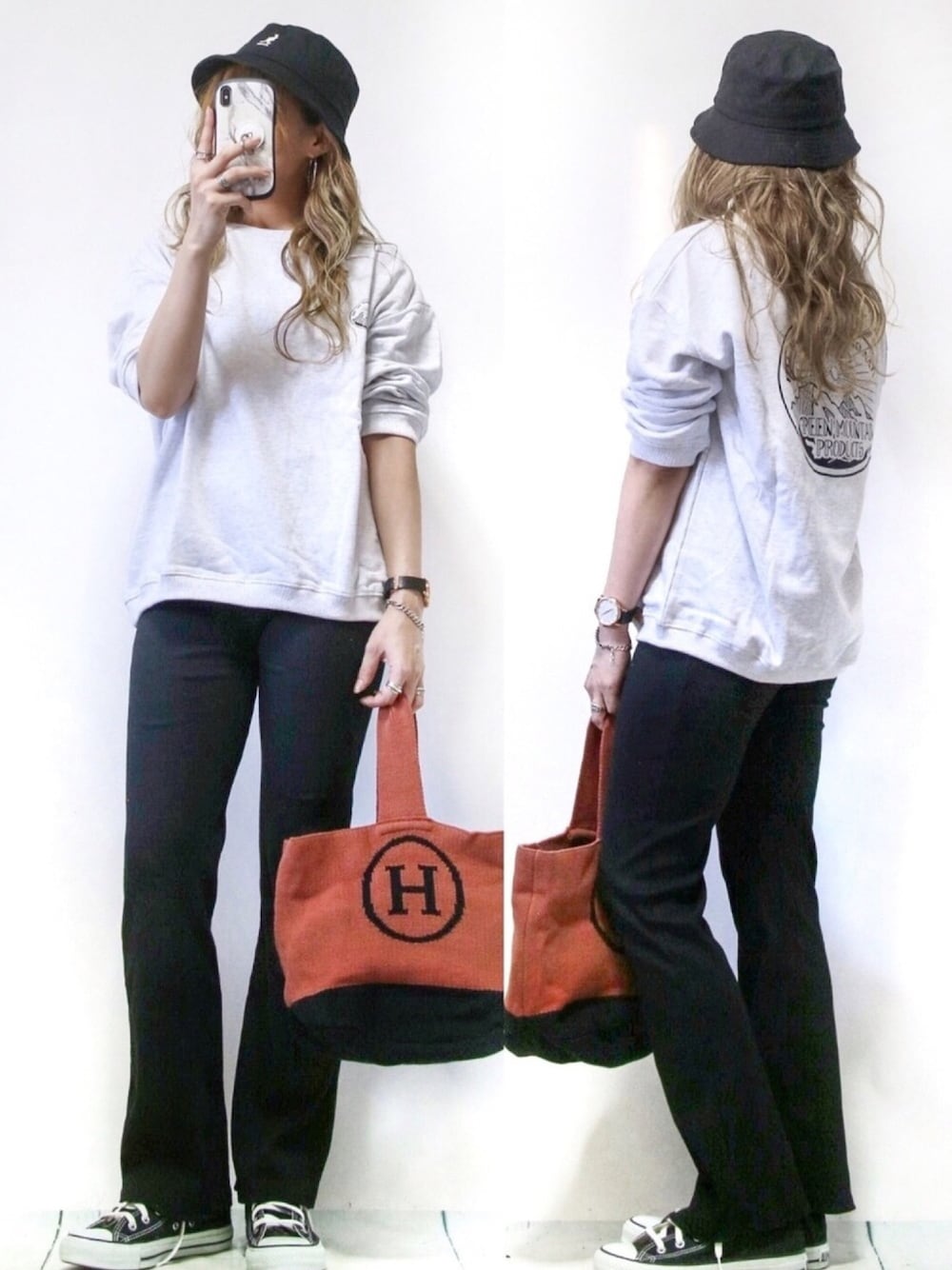 カンゴールのバケットハットはツバの長さいい感じって友達にも褒められたやつ😊 褒められて更に気に入った‼︎ スウェットは実はグレー。 オートミールっていうやつ。霜降り模様があるやつで柔らかい雰囲気でカジュアルコーデに合わせやすいんです。 線の細いプリントがお気に入り♡ インスタのDMは順次お返事させて頂いてます🥰💌 (インスタ→@yuberra.01) スウェット(F)/グレー フレアパンツ(F)/ブラック くつ(4h)/ブラック 足の大きさは23.5cmです☺️
