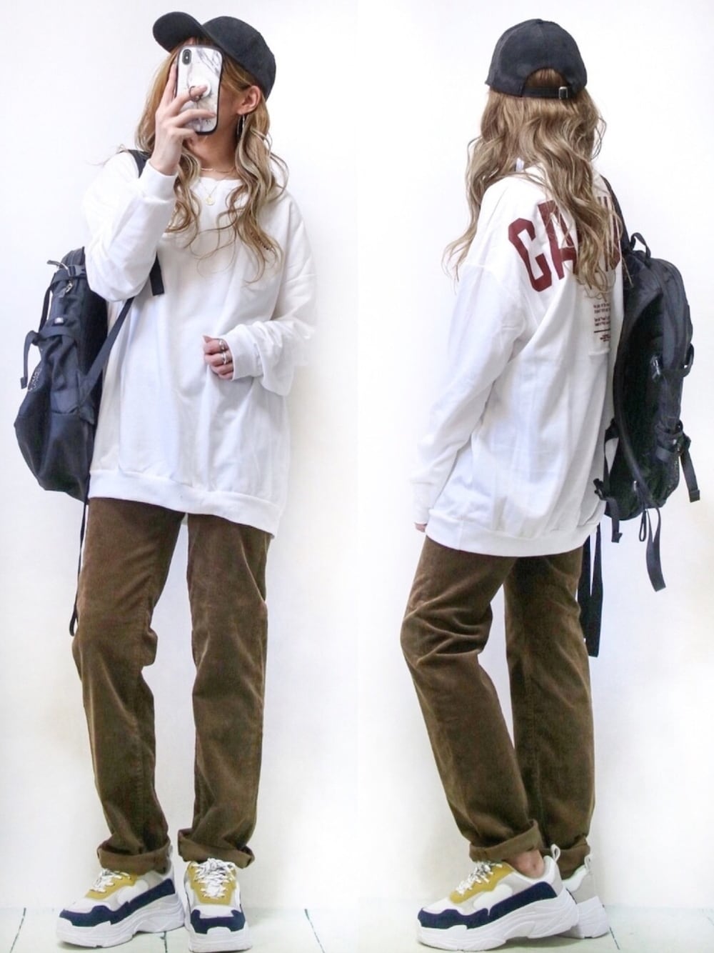 UNIQLOのパンツは9月20日に投稿した紫パンツの色違い。ストレッチ効いてるコーデュロイパンツで楽チンです🙌🏽😊 友達とも不思議やんな〜って話してて、ボリュームのある靴って足が綺麗に見えるんです❗️だからダッドスニーカーも美脚効果ありました! 今回のは厚底で身長も盛ってくれるし更にありがたい(◍˃ ᵕ ˂◍)配色もめちゃ可愛いくて、白を使うコーデにも映える気がします✨ 今日はたくさんの色使いました٩(*´꒳`*)۶ スウェット☞くすみレッド❤️(プリント) パンツ☞ブラウン🤎 スニーカー☞ネイビーと黄色💙💛 インスタのDMは順次お返事させて頂いてます🥰💌 (インスタ→@yuberra.01) スウェット/ホワイト コーデュロイパンツ(24)/ブラウン くつ(medium)/ネイビー 足の大きさは23.5cmです☺️