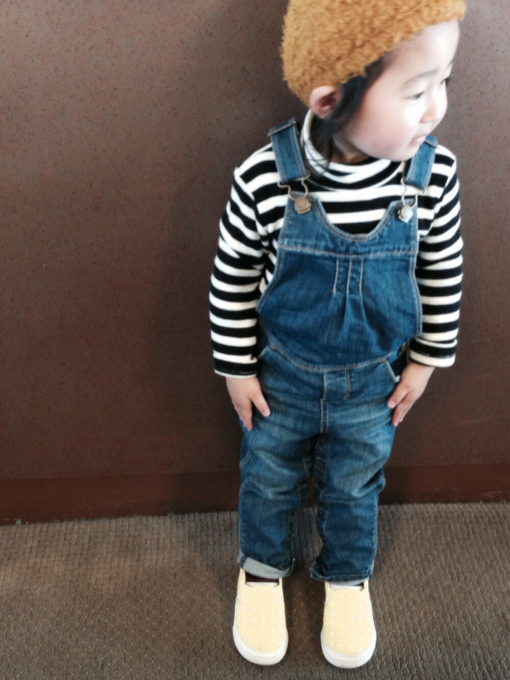 トップス:西松屋 オーバーオール:GAP スニーカー:GAP ニット:コキチカ