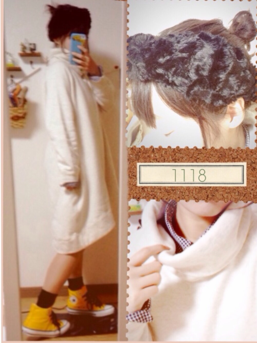 おともだちと弾丸日帰り大阪旅行に行きました✩ ゆるーいハイネックワンピからギンガムチェックをちら見せ。 ボブですがお団子にしてもこもこヘアバンドでまとめました。 あるきやすさ重視できいろのコンバースです♡
