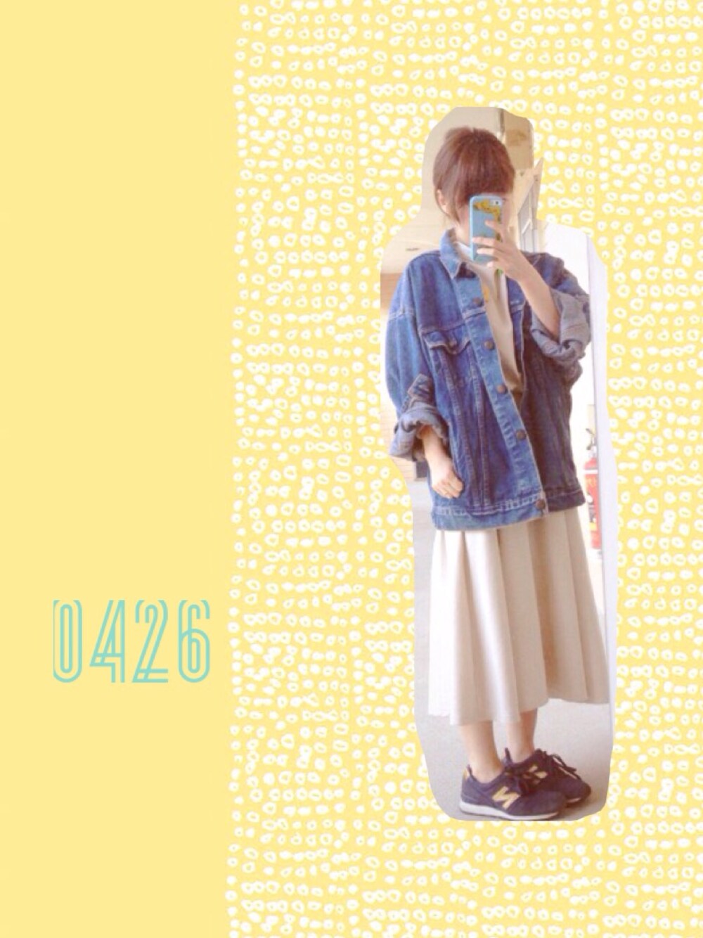 甘めのワンピースを オーバーサイズのデニムジャケットで 甘くなりすぎないように。。 スニーカーも暗めのお色を選びました。