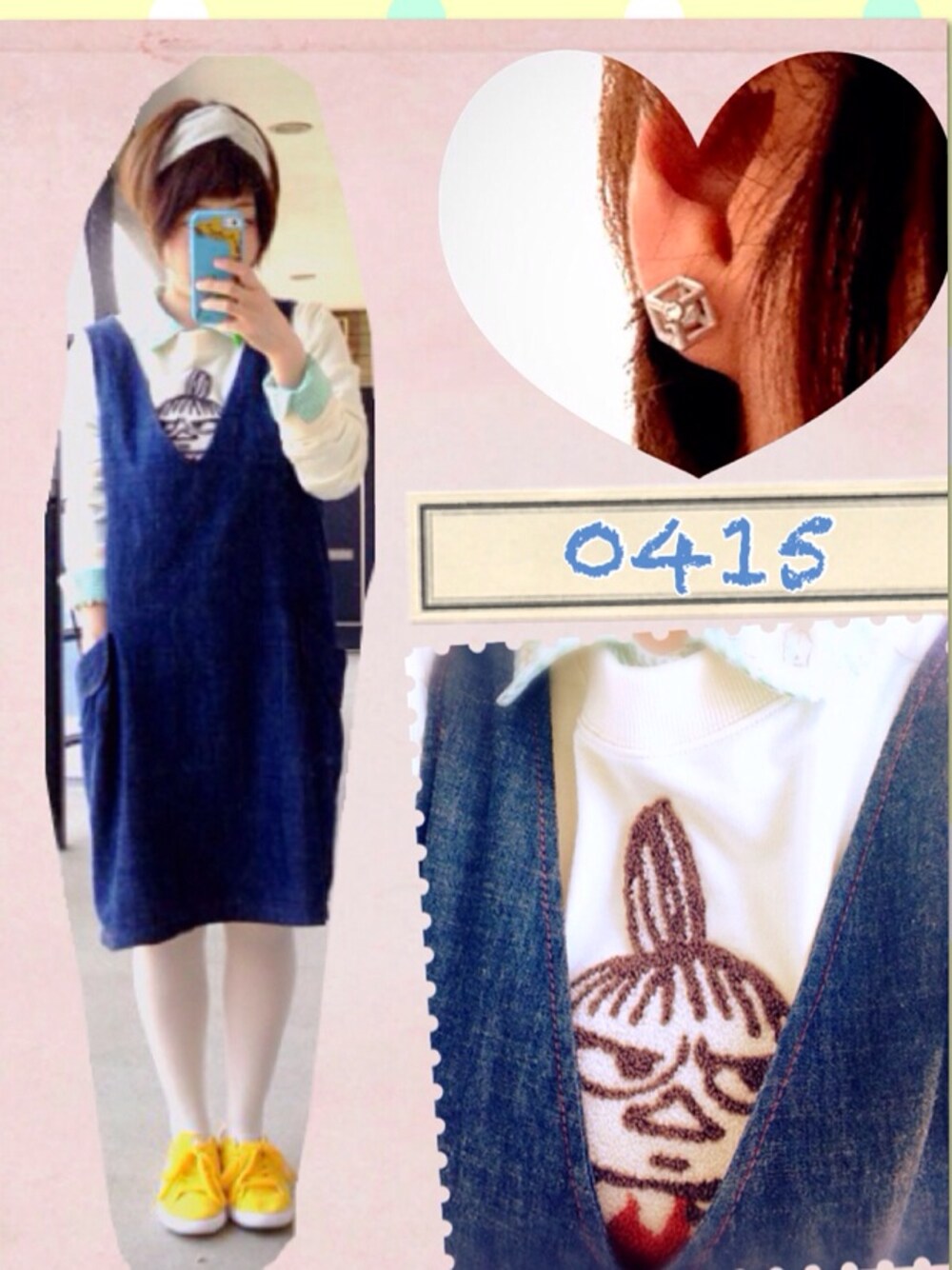 ゆちこのワンピース「スカラップポケットデニムジャンパースカート」を使ったコーディネート