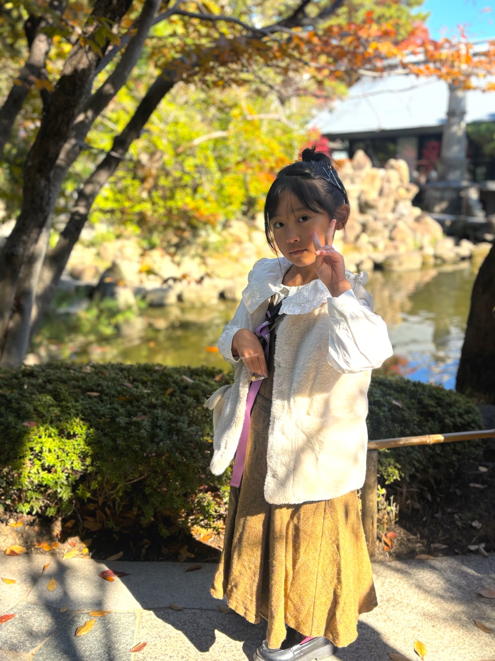 天気が良かったからアウターはなしのベストで軽く。寒さ対策のロングスカート! 七五三&御宮参りの付き添い、固すぎない感じのキレイめに🙏🏻💓