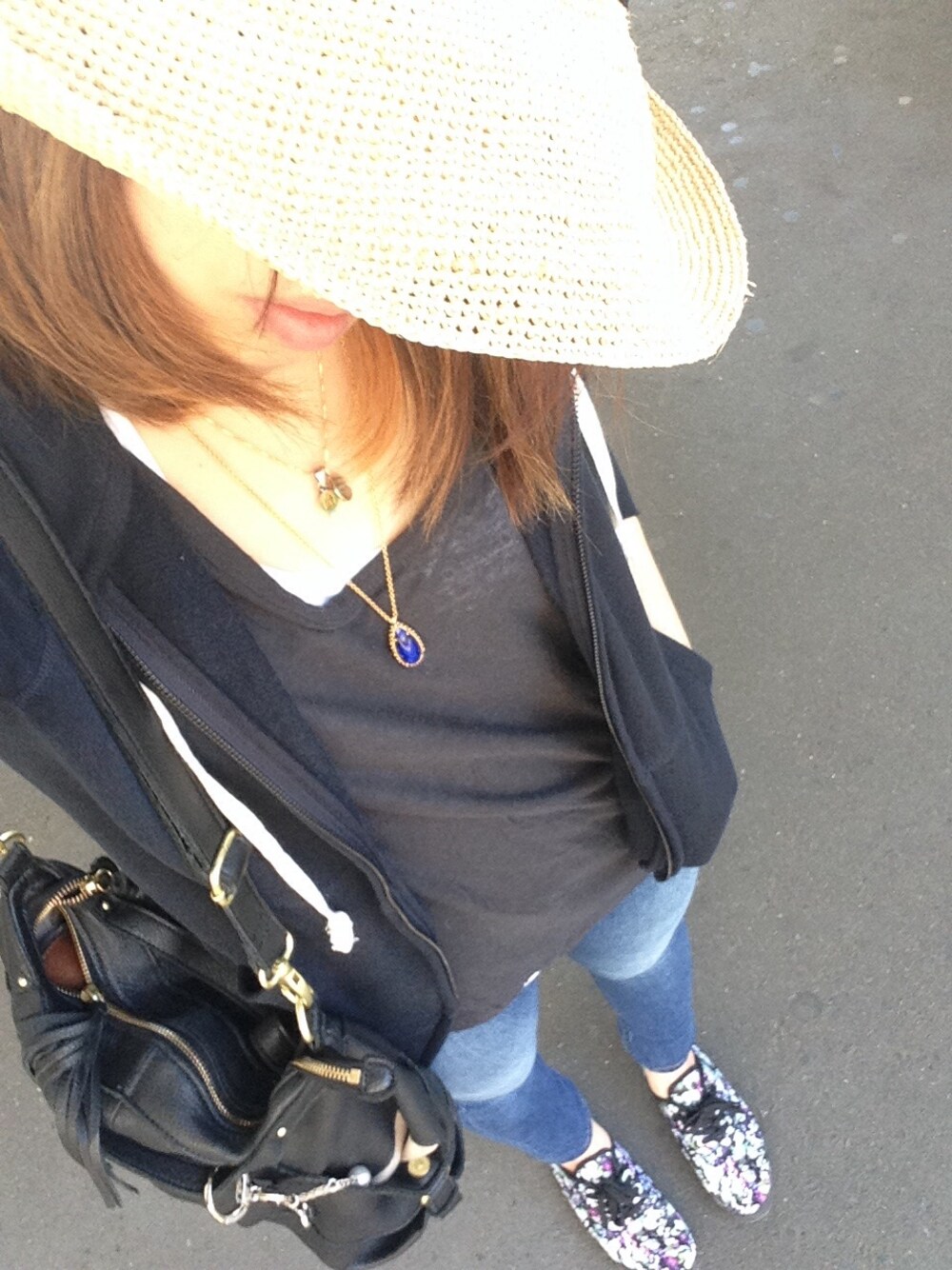 アクセントはラピスラズリのネックレス♥︎ これからはハットも必須かも〜あつ〜い Tops T shirts : ALEXANDER WANG Outer : 無印 Bottoms : Acne Shoes : GU Bag : nano universe
