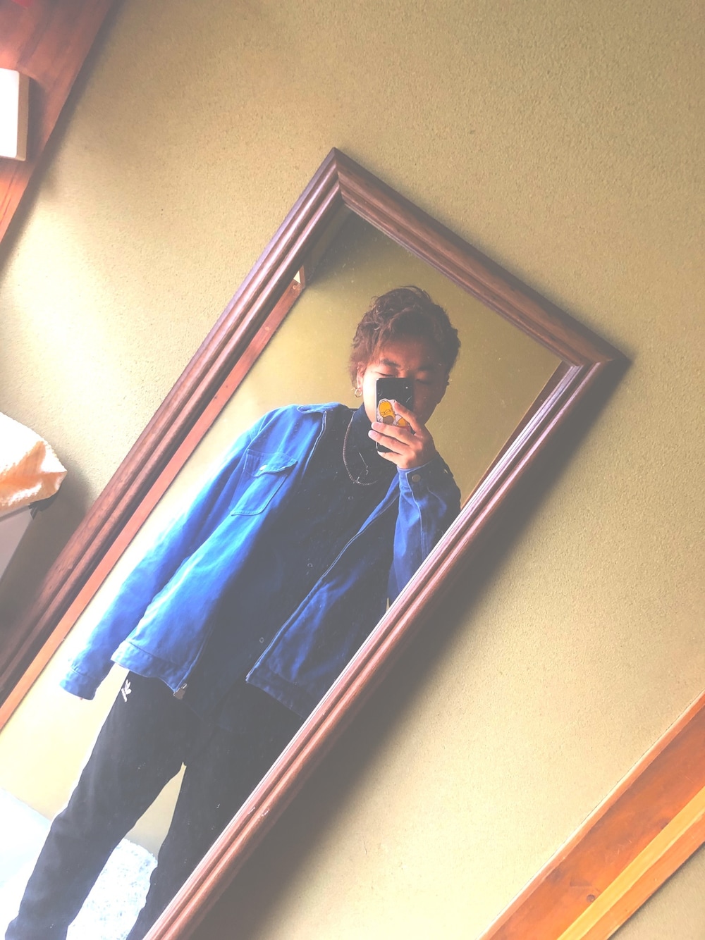 ブラック系のシャツ/ブラウス、ブルー系のデニムジャケット、ブラック系のパンツを着用したメンズの秋コーディネートの1枚目の写真