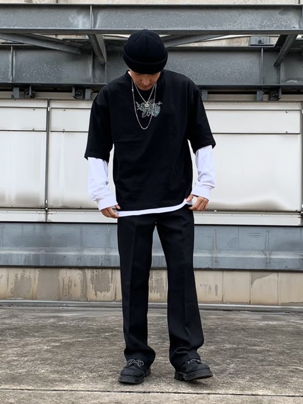 真ん中に薔薇の刺繍がほどこされた黒Tシャツベースに仕上てみました。Wranglerのフレアパンツでモード感も出しつつ ストリートスタイルでまとめました。