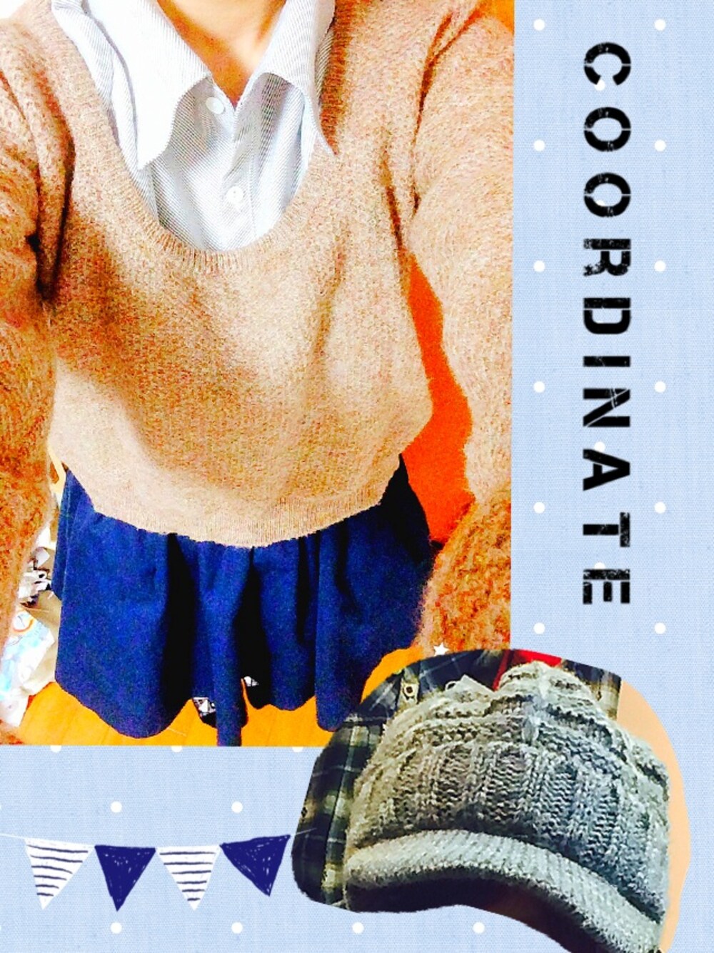 どっちが見やすいか研究中です! ガーリーコーデのポイントはー、茶色のニットっ 紺のスカートはまじお気に入り♡