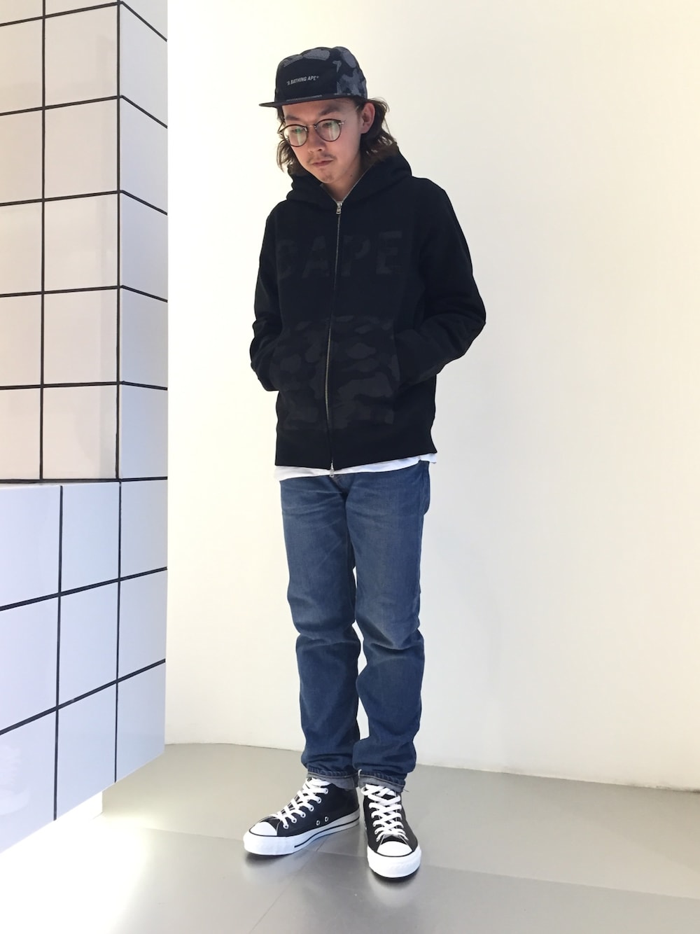 キャップとパーカーを同じ柄で揃えたシンプルなコーディネートです。リフレクションカモは光に反射する素材を使用したインパクトのあるアイテムで シンプルになりがちなブラックコーディネートのアクセントにもなります!!