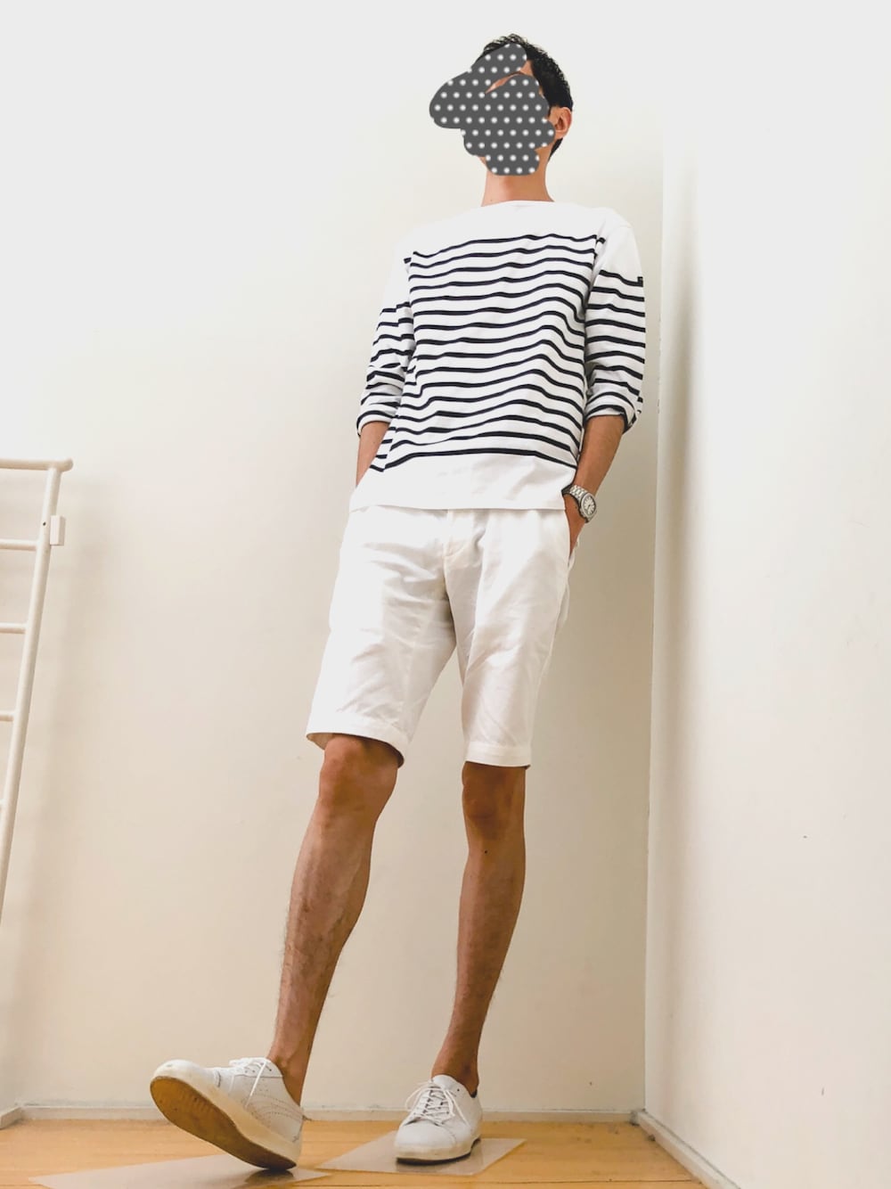 暑いので半ズボン😊 いつも色だけアプリで調節してるんですが、真っ白コーデのせいか、なんか変な色に💦💦 すね毛も目立つし恥ずかしい😓