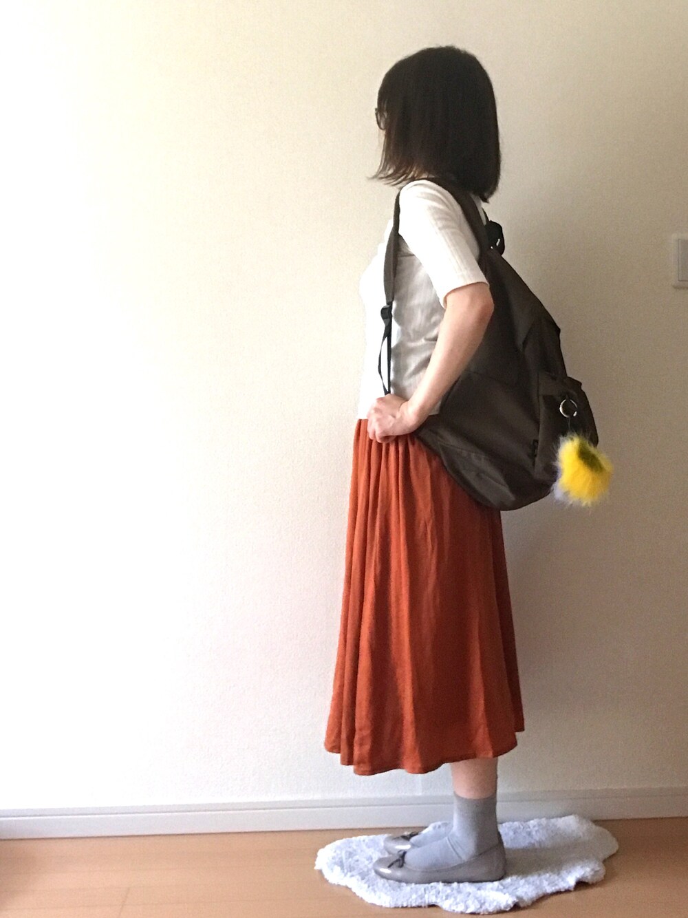 ホワイト系のTシャツ/カットソー、グレー系のバレエシューズ、ブラウン系のスカートを着用したレディースの秋コーディネートの1枚目の写真