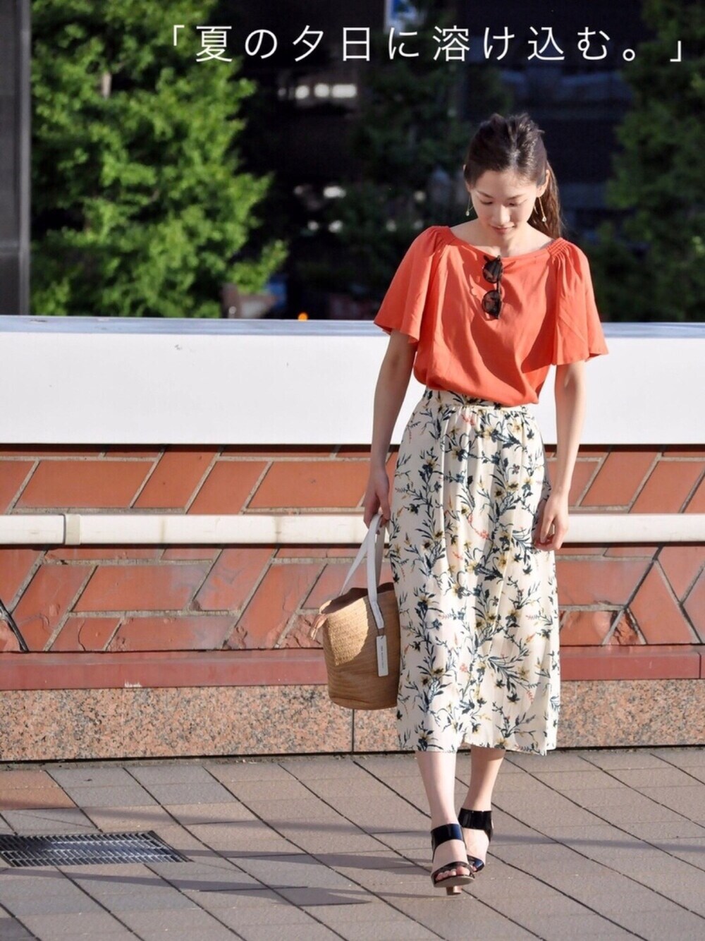フラワープリントのスカートをTシャツで合わせて夏らしい着こなしにしてみました🌞👒