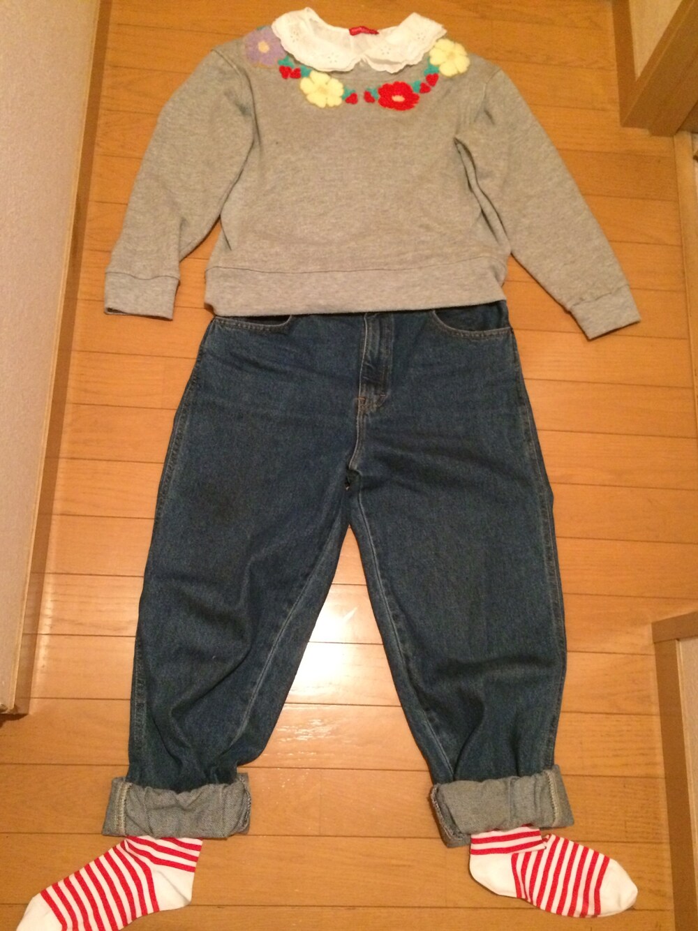 靴下雑でごめんなさい(;_;) スニーカーを合わせてはいてます。 ブラウスと花柄の相性がいい感じです。