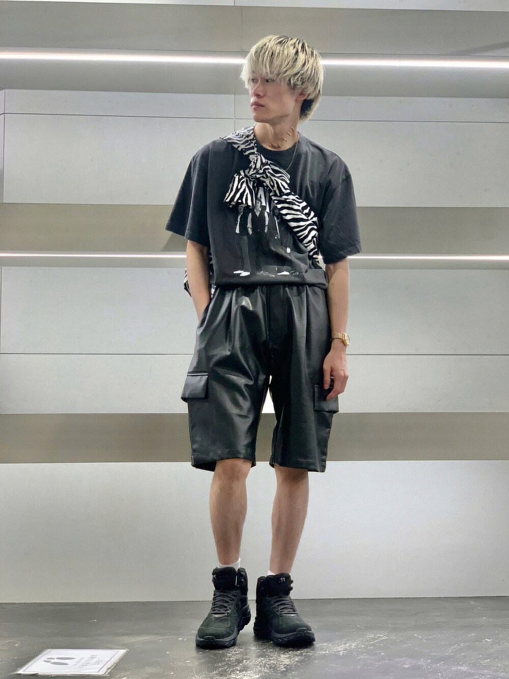 夏のモードブラックコーデです! プリントTに柄シャツを襷掛けと、一見しつこそうですが、モノトーンなので散らかって見えません! 宜しければインスタのフォローもお願い致します! @urbanresearch_id @ur._yui