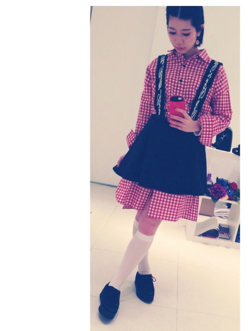 shirts op / Dolly&Molly skirt / Dolly&Molly おNEWのシャツワンピースにサスペンダースカート あえて裾を出して一体化!