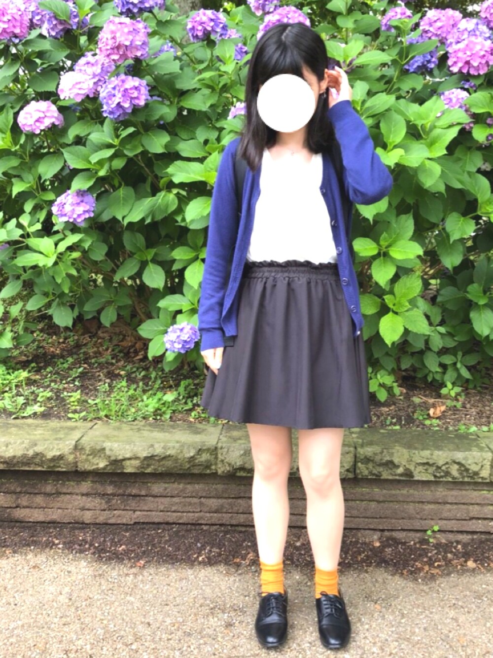 梅雨コーデ 梅雨らしく紫陽花の前で写真撮りました トップスとスカートに見えるけど 実はワンピースです👗 シンプルなデザインで合わせやすいのでお気に入りです(o˘◡˘o)✨ この日は肌寒かったので カーディガン着てます✌︎ こちらも合わせやすくて重宝してます☺️ 全体的に暗めなので マスタードカラーの靴下を投入してアクセントに! 写真だと見えませんが、ネイルも梅雨をイメージしています☔︎