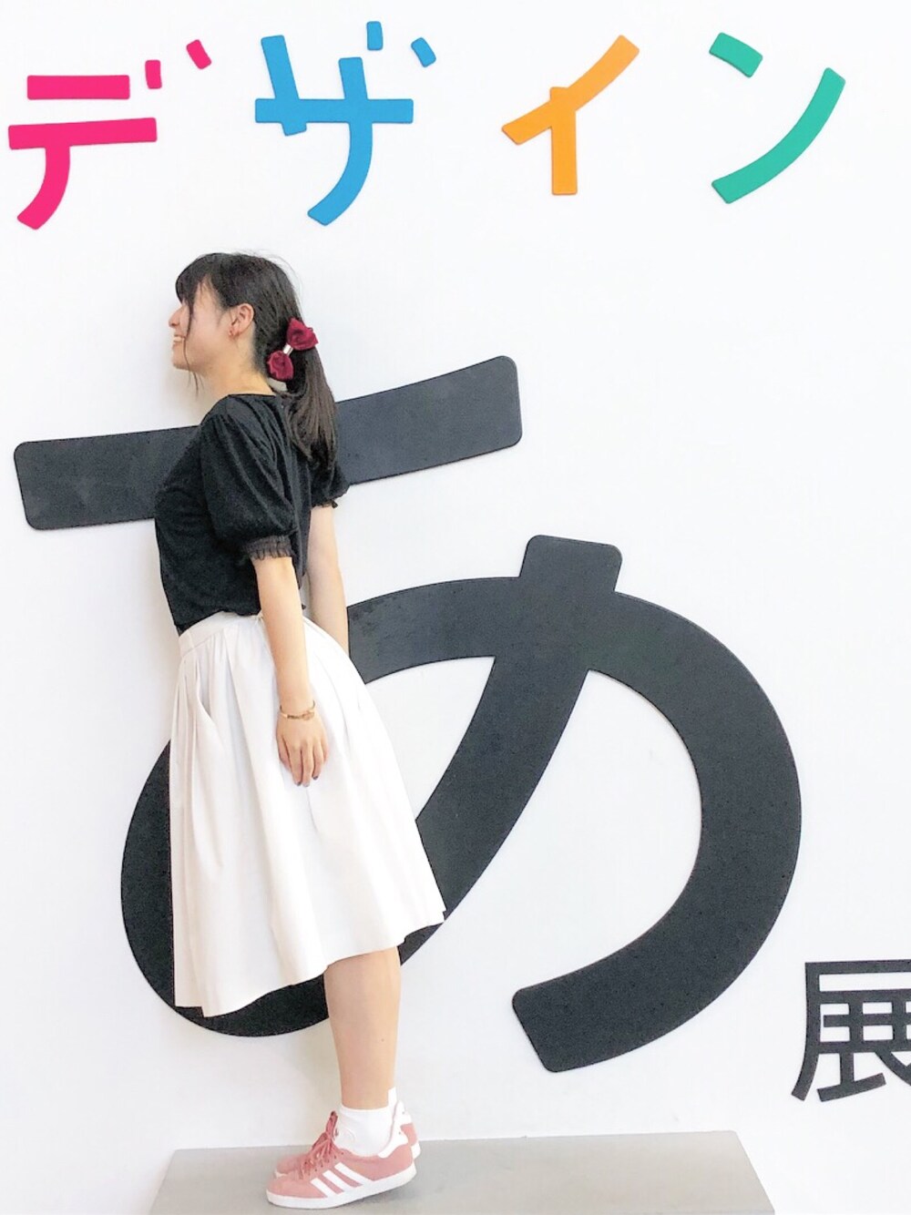 モノトーンコーデ! 足元ピンクとバナナクリップ赤で色足し ガーリーなコーデだけど スニーカーでカジュアルさ出しました