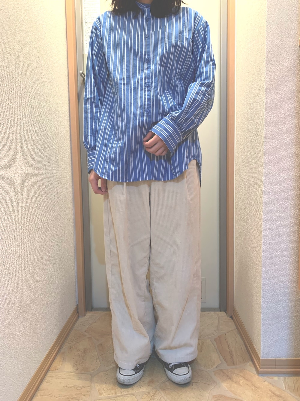 今日は暖かったので、シャツコーデ👔 青のストライプシャツお気に入り。